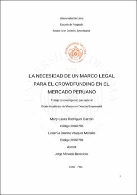 Rodríguez Garzón, M. L. y Vásquez Morales, L. J. (2019). La necesidad de un marco legal para el crowdfunding en el mercado peruano [Trabajo de investigación para optar el grado académico de Maestro en Derecho Empresarial]. Repositorio Institucional de la Universidad de Lima. https://hdl.handle.net/20.500.12724/10016Editor