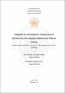 Este proyecto tiene como fin elaborar una propuesta comunicacional para el próximo lanzamiento de Villa de Atletas, complejo habitacional en Villa el Salvador, para adultos jóvenes y adultos, hombres y mujeres, de 31 a 59 años del NSE C y D que residen, principalmente, en Lima Sur, casados o convivientes, con o sin hijos con interés de independizarse por la compra de una propiedad mediante algún tipo de financiamiento a principios del año 2020.