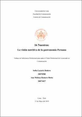 Lazarte Dodero, S. y Romero Botto, A. M. (2019). 16 Nuestros:La visión nutritiva de la gastronomía peruana (trabajo de suficiencia profesional para optar el título profesional de Licenciado en Comunicación).Universidad de Lima.Editor