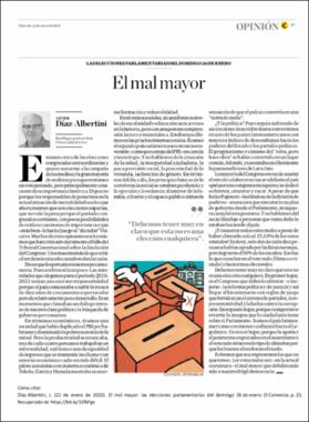 Díaz Albertini, J. (22 de enero de 2020). El mal mayor: las elecciones parlamentarias del domingo 26 de enero. El Comercio, p. 23. Recuperado de https://bit.ly/32fkPgvEditor