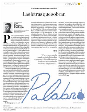 Cuevas Calderón, E. (10 de mayo de 2019). Las letras que sobran: el denominado lenguaje inclusivo. El Comercio, p. 31. Recuperado de https://bit.ly/3806JkJEditor