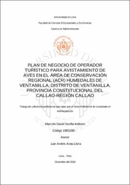 Regarding to the Operations Plan, a description is made of what will be the service provided by the company posed, as well as the main characteristics of the place where the service would be performed, such as its location with UTM coordinates, climate, hydrology, etc. El presente plan de negocio pretende mostrar la viabilidad económica de implementar un operador turístico para la observación de aves en el Área de Conservación Regional (ACR) Humedales de Ventanilla, para lo cual se realizó un estudio de mercado bibliográfico basado en información proporcionada por una institución adscrita al Ministerio de Comercio Exterior y Turismo.