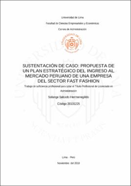 Salcedo Hermenegildo, S. (2019). Sustentación de caso: propuesta de un plan estratégico del ingreso al mercado peruano de una empresa del sector fast fashion (trabajo de suficiencia profesional para optar el título profesional de Licenciado en Administración). Universidad de Lima.Editor