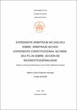 Amprimo Abusada, S. O. (2019). Expediente arbitraje No.1545-2013 sobre: arbitraje ad hoc Expediente constitucional No.00009-2014-TC-AI sobre: acción de inconstitucionalidad (trabajo de suficiencia profesional para optar el título profesional de Abogado). Universidad de Lima.Editor