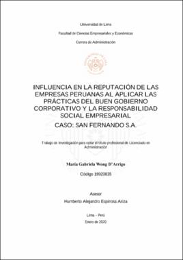 Wong-D’Arrigo, M. G. (2020). Influencia en la reputación de las empresas peruanas al aplicar las prácticas del Buen Gobierno Corporativo y la Responsabilidad Social Empresarial. Caso: San Fernando S.A. (Trabajo de investigación para optar el Título Profesional de Licenciado en Administración). Universidad de Lima.Editor