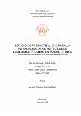 This work seeks to determine the technical, economic and market feasibility for the implementation of a premium lodge hotel, with an ecological focus, in the Madre de Dios region, applying various industrial engineering methods for its development, in order to be able build it in the future.