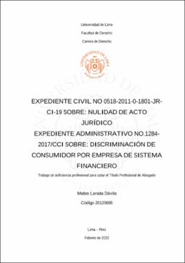 Lanata Dávila, M. (2020). Expediente civil No 0518-2011-0-1801-JR-CI-19 sobre: nulidad de acto jurídico Expediente administrativo No.1284-2017/CCI sobre: discriminación de consumidor por empresa de sistema financiero (trabajo de suficiencia profesional para optar el título profesional de Abogado). Universidad de Lima.Editor