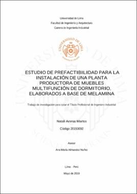 Regarding the financial and economic analysis, an investment of 1 008 629 soles was determined, in which 60% corresponds to external financing by a banking entity. A financial NPV of 944,102 soles, a financial IRR of 74% and a cost benefit value equal to 3.34 soles were estimated in the project's life horizon corresponding to 6 years, in addition to an estimated investment recovery period of 2 years, 7 months and 2 days, demonstrating the financial viability of the project. Finally, a positive effect on the contribution to society is determined since an aggregate value of 6,529,182.40 soles and a capital density of 18,678.31 soles / employment is generated. Se busca con el presente estudio aplicar las herramientas y conceptos obtenidos en la carrera de ingeniería industrial para la implementación de una planta productora de muebles de dormitorio. Este producto tiene como mercado meta a Lima Metropolitana, dirigiéndose a los niveles socioeconómicos B y C1. Asimismo, se segmenta según rango etario a personas desde 18 a 55 años. El producto se comercializa desarmado a un precio de S/.1 203,60, el cual incluye la instalación y envío.