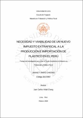 Anto Chiong, J. (2020). Necesidad y viabilidad de un nuevo impuesto extrafiscal a la producción e importación de plástico en el Perú [Trabajo de Investigación para optar el Grado Académico de Maestro en Tributación y Política Fiscal]. Repositorio Institucional de la Universidad de Lima. https://hdl.handle.net/20.500.12724/11370Editor