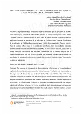 El presente trabajo tiene como objetivo demostrar que la aplicación de las MEI como método para controlar la inflación fue efectivo en los siguientes países: Brasil, Chile, Colombia y Perú. La metodología que se aplicó fue la de medias pareadas y regresión múltiple; analizando un grupo de años antes de la aplicación de EMEI, con otro grupo de años después de la aplicación de EMEI en las economías y ver cuál de las dos variables: Tasa de interés y Tipo de cambio, influye más en el cambio de la inflación. Con los resultados obtenidos podemos observar que la implementación de EMEI ha resultado ser efectivo, ya que en los países analizados se muestra una reducción considerable de la inflación después de su implementación, junto con esto podemos observar que la variable que tiene más influencia con la inflación es la tasa de interés, es decir, que la tasa de interés causa un mayor efecto en los cambios de la inflación.