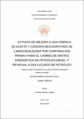 The annual savings resulting from switching from oil to LPG allowed the client to achieve a higher profit margin for the sale of its products. El presente trabajo contempla el estudio de mejora para el cambio de matriz energética en una fábrica de aceite de limón y cáscara de limón deshidratada, en el norte del país.