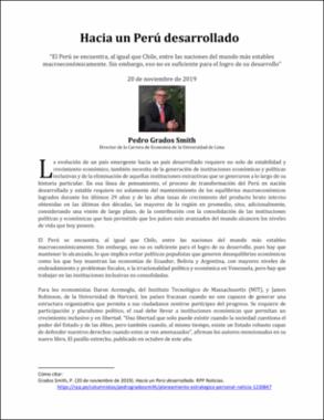 La evolución de un país emergente hacia un país desarrollado requiere no solo de estabilidad y crecimiento económico, también necesita de la generación de instituciones económicas y políticas inclusivas y de la eliminación de aquellas instituciones extractivas que se generaron a lo largo de su historia particular. En esa línea de pensamiento, el proceso de transformación del Perú en nación desarrollada y estable requiere no solamente del mantenimiento de los equilibrios macroeconómicos logrados durante los últimos 29 años y de las altas tasas de crecimiento del producto bruto interno obtenidas en las últimas dos décadas, las mayores de la región en promedio, sino, adicionalmente, considerando una visión de largo plazo, de la contribución con la consolidación de las instituciones políticas y económicas que han permitido que los países más avanzados del mundo alcancen los niveles de vida que hoy poseen.