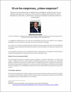 Del Solar, E. (9 de enero de 2020). IA en las empresas, ¿cómo empezar? RPP Noticias. https://rpp.pe/columnistas/eduardodelsolar/ia-en-las-empresas-como-empezar-noticia-1238585Editor