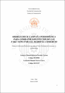 Paredes Vereau, G. M. R. y Torres-Cueva, L. M. (2020). #DobleCheck campaña periodística para combatir los efectos de las fake news para el diario El Comercio [Trabajo de suficiencia profesional para optar el Título Profesional de Licenciado en Comunicación, Universidad de Lima]. Repositorio Institucional Ulima. https://hdl.handle.net/20.500.12724/11776Editor