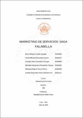 Sotelo Aguilar, N. M., Benavides García, V. M., Contreras Donayre, C. J., Fernandez Choque, M. A., Vinces Flores, M. R. y Perry Zimmerman, C. A. (2020). Marketing de servicios: Saga Falabella [trabajo de fin de curso]. Universidad de Lima, Facultad de Ciencias Empresariales y Económicas, Carrera de Marketing.Editor