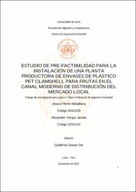 The clamshells are one of the packages that allows greater protection during distribution. On the other hand, it is currently a trend in the outlets since it is a rigid container that protects the fruit from handling and can visualize the state of this at all times. En el presente trabajo se muestra un estudio de pre factibilidad para la instalación de una planta productora de envases pet clamshell para frutas en el canal moderno, donde se evalúa la viabilidad técnica, económica-financiera y de mercado. Este producto busca promover la venta en pequeños empresarios de la industria frutícola.