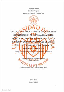 Gonzales Fonseca, S. K. (2020). Crítica a la aplicación de las reglas de construcción al cofinanciamiento para la determinación del impuesto a la renta en las concesiones de obras públicas de infraestructura y de servicios públicos [Trabajo de Investigación para optar el Grado Académico de Maestro en Tributación y Política Fiscal, Universidad de Lima]. Repositorio Institucional de la Universidad de Lima.Editor