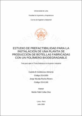 Finally, we propose the economic and financial analysis of the project, having favorable results after evaluating the investment, loans, defining our budget and Financial Statements, analyzing the indicators and evaluating the ratios, as well as socially evaluating our project. El presente trabajo tiene como finalidad evaluar la prefactibilidad de la instalación de una planta productora de botellas a partir de un polímero biodegradable, estableciendo su viabilidad técnica, económica, de mercado y social, considerando una gran oportunidad en la industria de los plásticos.