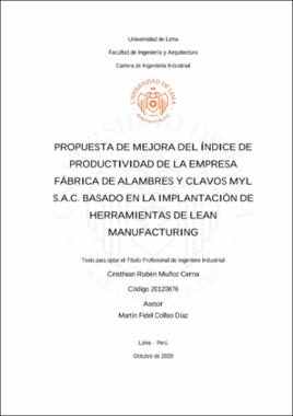 Muñoz Cerna, C. R. (2020). Propuesta de mejora del índice de productividad de la Empresa Fábrica de Alambres y Clavos MYL S.A.C. basado en la implantación de herramientas de lean manufacturing [Tesis para optar el Título Profesional de Ingeniero Industrial, Universidad de Lima]. Repositorio ULima. https://hdl.handle.net/20.500.12724/12073Editor