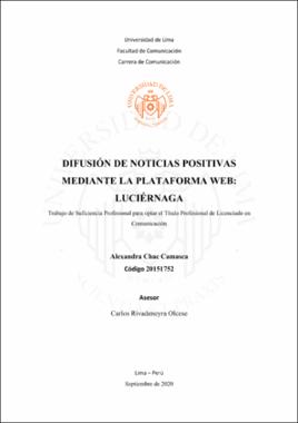 Chac Camasca, A. (2020). Difusión de noticias positivas mediante la plataforma web: Luciérnaga [Trabajo de suficiencia profesional para optar el Título Profesional de Licenciado en Comunicación, Universidad de Lima]. Repositorio Institucional de la Universidad de Lima. https://hdl.handle.net/20.500.12724/12180Editor