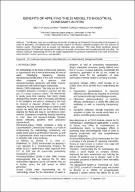 The following study aims at analyzing the benefits of applying the 5S Model to Peruvian industrial companies by means of descriptive, non-experimental, mixed methods research on Peruvian industrial companies that have won the 5S National Award. Techniques such as surveys and interviews were employed. This study found correlation between implementing the 5S Model and management models such as quality, environment and occupational health and safety. The research concluded implementing the 5S on the studied organizations has generated improvements in the work environment, waste reduction, worker’s performance and reputation. Keywords – 5S, Continuous Improvement, Waste Reduction, Lean Manufacturing, Management Models.
