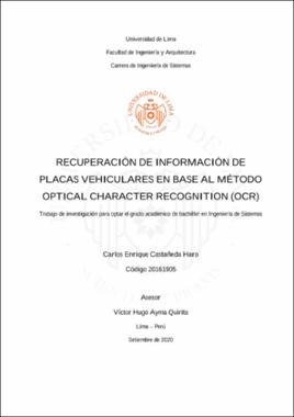 Castañeda Haro, C. E. (2020). Recuperación de información de placas vehiculares en base al método optical character recognition (OCR) [Trabajo de Investigación para optar el grado de Bachiller en Ingeniería de Sistemas, Universidad de Lima]. Repositorio institucional de la Universidad de Lima. https://hdl.handle.net/20.500.12724/12343Editor