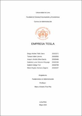 Tello Sáenz, D. A., Valer Llenera, T., Silva García, J. A., Vizcarra Roquego, G. L., Zuñiga Tori, G. y Zegarra, M. R. X. (2020). Empresa Tesla [trabajo de fin de curso]. Universidad de Lima, Facultad de Ciencias Empresariales y Económicas, Carrera de Administración. https://hdl.handle.net/20.500.12724/12556Editor
