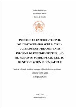 Torres Leon, M. (2020). Informe de expediente civil NO. De-CONTRA0038 sobre: civil- cumplimiento de contrato. Informe de expediente penal NO DE-PENAL0131 sobre: penal-delito de negociación incompatible [Trabajo de suficiencia profesional para optar el Título Profesional de Abogado, Universidad de Lima]. Repositorio institucional de la Universidad de Lima. https://hdl.handle.net/20.500.12724/12763Editor