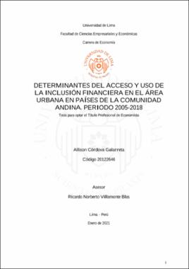 Córdova Galarreta, A. (2021). Determinantes del acceso y uso de la inclusión financiera en el área urbana en países de la Comunidad Andina. Periodo 2005-2018. [Tesis para optar el Título Profesional de Economista, Universidad de Lima]. Repositorio Institucional de la Universidad de LimaEditor