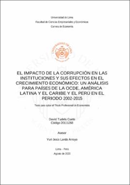 Tudela Cueto, D. (2020). El impacto de la corrupción en las instituciones y sus efectos en el crecimiento económico: un analisis para países de la OCDE, América Latina y el Caribe y el Perú en el Periodo 2002-2015 [Tesis para optar el Título Profesional de Economista, Universidad de Lima]. Repositorio de la Universidad de LimaEditor