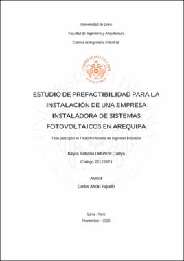 Del Pozo Cunya, K. T. (2020). Estudio de prefactibilidad para la instalación de una empresa instaladora de sistemas fotovoltaicos en Arequipa [Tesis para optar el Título Profesional de Ingeniero Industrial, Universidad de Lima]. Repositorio institucional de la Universidad de Lima. https://hdl.handle.net/20.500.12724/12813Editor