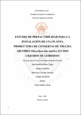 Nuñez Tapia, J. A. y Cornejo Gaviria, M. (2021). Estudio de prefactibilidad para la instalación de una planta productora de conservas de trucha arcoíris (Oncorhynchus mykiss) en dos líquidos de gobierno [Tesis para optar el Título Profesional de Ingeniero Industrial, Universidad de Lima]. Repositorio institucional de la Universidad de Lima. https://hdl.handle.net/20.500.12724/13144Editor