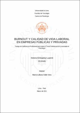 Echegaray Luperdi, X. (2021). Burnout y calidad de vida laboral en empresas públicas y privadas [Trabajo de suficiencia profesional para optar el Título Profesional de Licenciado en Psicología, Universidad de Lima]. Repositorio Institucional de la Universidad de LimaEditor