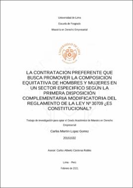 Lopez Gomez, C. M. (2021). La contratación preferente que busca promover la composición equitativa de hombres y mujeres en un sector específico según la primera disposición complementaria modificatoria del Reglamento de la Ley N° 30709 ¿es constitucional? [Trabajo de investigación para optar el Grado Académico de Maestro en Derecho Empresarial, Universidad de Lima]. Repositorio Institucional de la Universidad de Lima.Editor