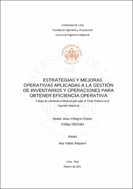 Villagra Chavez, N. J. (2021). Estrategias y mejoras operativas aplicadas a la gestión de inventarios y operaciones para obtener eficiencia operativa [Trabajo de suficiencia profesional para optar el Título Profesional de Ingeniero Industrial, Universidad de Lima]. Repositorio institucional de la Universidad de Lima. https://hdl.handle.net/20.500.12724/13252Editor