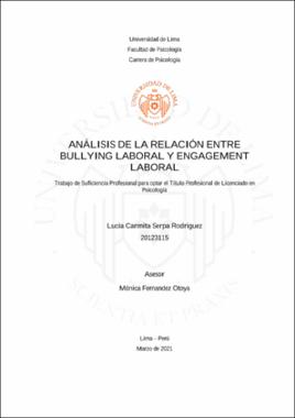 Serpa Rodriguez, L. C. (2021). Análisis de la relación entre bullying laboral y engagement laboral [Trabajo de suficiencia profesional para optar el Título Profesional de Licenciado en Psicología, Universidad de Lima]. Repositorio institucional de la Universidad de Lima. https://hdl.handle.net/20.500.12724/13270Editor