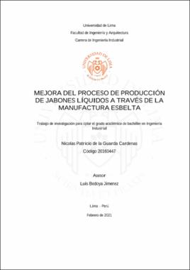 De la Guarda Cardenas, N. P. (2021). Mejora del proceso de producción de jabones líquidos a través de la manufactura esbelta [Trabajo de Investigación para optar el grado de Bachiller en Ingeniería Industrial, Universidad de Lima]. Repositorio Institucional de la Universidad de Lima. https://hdl.handle.net/20.500.12724/13301Editor