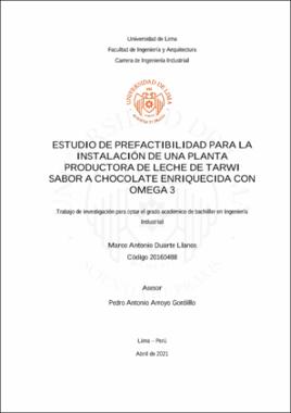Duarte Llanos, M. A. (2021). Estudio de prefactibilidad para la instalación de una planta productora de leche de tarwi sabor a chocolate enriquecida con omega 3 [Trabajo de Investigación para optar el grado de Bachiller en Ingeniería Industrial, Universidad de Lima]. Repositorio Institucional de la Universidad de Lima. https://hdl.handle.net/20.500.12724/13718Editor