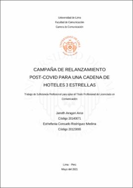 Aragon Arce, J. & Rodriguez Medina, E. C. (2021). Campaña de relanzamiento post-covid para una cadena de hoteles 3 estrellas [Trabajo de suficiencia profesional para optar el Título Profesional de Licenciado en Comunicación, Universidad de Lima]. Repositorio Institucional de la Universidad de Lima.Editor