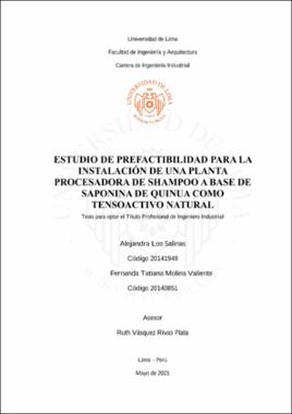 In the present investigation, the economic, commercial, social, technological and environmental feasibility was evaluated for the installation of a shampoo plant based on quinoa saponin as a natural surfactant, in order to be able to satisfy the basic hair care needs of our market, by means of a product that uses a natural by-product of quinoa as raw material, being friendly to the human scalp and the environment. Firstly, a market study was carried out, obtaining a demand for the last year of the project's useful life of 9,782 boxes; each one containing 12 bottles of shampoo of 500 ml. Then we determined the marketing strategy to be used, focusing on one of differentiation of our product based on quality. Later, a plant location study was carried out using the "Factor Ranking" and "Brown & Gibson" methods, concluding that the best location to establish our plant is the district of Lurin, Lima. Likewise, a calculation was made to determine the capacity of the plant based on our production lot, finding a value of 47,174 boxes per year; this being less than our Technology size which corresponds to 62,122 boxes, giving us an opportunity for future expansion. For the engineering section of the project, we described the production process, the machines to be used, the design of the facilities, the quality standards related to the product, the environmental impact generated, the safety and protection measures, and the layout of the plant. With the analysis carried out, a plant of 1030.84 m2 was obtained. Finally, the economic evaluation of the project was carried out with an investment of S/. 664,863.43; obtaining an economic NPV of S/. 514,840.10, an IRR of 46% and a recovery period of 3.54 years. On the other hand, for the financial evaluation a NPV of S/. S/. 592,972.92, an IRR of 61% and a recovery period of 2.18 years were obtained. Therefore, it was decided to seek financial support from Banco Continental to obtain more viable indicators for the development of the company. En la presente investigación se evaluó la viabilidad económica, comercial, social, tecnológica y medioambiental para la instalación de una planta productora de shampoo a base de saponina de quinua como tensoactivo natural, con el fin de poder satisfacer las necesidades básicas de cuidado capilar de las personas que pertenecen al mercado objetivo, mediante un producto que emplea como materia prima un subproducto natural de la quinua, siendo amigable con el cuero cabelludo del ser humano y con el medio ambiente. En primer lugar, se realizó un estudio de mercado obteniendo una demanda para el último año de vida útil del proyecto de 9,782 cajas; conteniendo cada una de ellas 12 botellas de shampoo de 500 ml. Luego se determinó la estrategia de comercialización a utilizar, centrándonos en una de diferenciación de nuestro producto basado en calidad. Posteriormente, se realizó un estudio de localización de planta mediante los métodos de “Ranking de Factores” y “Brown & Gibson”, concluyendo que la mejor ubicación para establecer nuestra planta es el distrito de Lurín, Lima. Asimismo, se hizo el cálculo para determinar la capacidad de la planta en base a nuestro lote de producción, hallando un valor de 47,174 cajas al año; siendo este menor a nuestro tamaño de Tecnología que corresponde a 62,122 cajas, otorgándonos una oportunidad de expansión a futuro. Para el acápite de ingeniería del proyecto, se describió el proceso de producción, las máquinas a emplear, el diseño de las instalaciones, las normas de calidad relacionadas al producto, el impacto ambiental generado, las medidas de seguridad y protección, y la disposición de la planta. Con el análisis realizado se obtuvo una planta de 1030.84 m2. Por último, se realizó la evaluación económica del proyecto con una inversión de S/. 664,863.43; obteniéndose un VAN económico de S/. 514,840.10, una TIR de 46% y un periodo de recupero de 3.54 años. Por otro lado, para la evaluación financiera se obtuvo un VAN de S/. 592,972.92, una TIR de 61% y un periodo de recupero de 2.18 años. Por lo tanto, se decidió buscar apoyo financieramente con el banco Continental para obtener indicadores más viables para el desarrollo de la empresa.