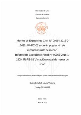 Quino Peñafiel, L. V. (2021). Informe de Expediente Civil No. 00584-2012-0-0412-JM-FC-02 Sobre Impugnación de Reconocimiento de Menor. Informe de Expediente Penal No 00056-2016-1-1509-JR-PE-02 Violación Sexual de Menor de Edad [Trabajo de suficiencia profesional para optar el Título Profesional de Abogado, Universidad de Lima]. Repositorio institucional de la Universidad de Lima.Editor