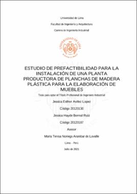 Avilez Lopez, J. E. y Bernal Ruiz, J. H. (2021). Estudio de prefactibilidad para la instalación de una planta productora de planchas de madera plástica para la elaboración de muebles [Tesis para optar el Título Profesional de Ingeniero Industrial, Universidad de Lima]. Repositorio institucional de la Universidad de Lima. https://hdl.handle.net/20.500.12724/14015Editor