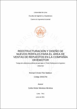 Flor Baldeon, R. V. (2021). Reestructuración y diseño de nuevos perfiles para el área de ventas de repuestos en la compañía Divemotor [Trabajo de suficiencia profesional para optar el Título Profesional de Ingeniero Industrial, Universidad de Lima]. Repositorio institucional de la Universidad de Lima. https://hdl.handle.net/20.500.12724/14024Editor