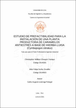 Chuquin Yactayo, C. W. y Nuñez Zevallos, A. F. (2021). Estudio de prefactibilidad para la instalación de una planta productora de caramelos antiestrés a base de hierba luisa (Cymbopogon citratus) [Tesis para optar el Título Profesional de Ingeniero Industrial, Universidad de Lima]. Repositorio institucional de la Universidad de Lima. https://hdl.handle.net/20.500.12724/14040Editor