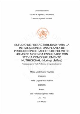 Garay Reynoso, M. L. e Ito Calderon, H. D. (2021). Estudio de prefactibilidad para la instalación de una planta de producción de sachets de polvo de hojas de moringa endulzado con stevia como suplemento nutricional (Moringa oleífera) [Tesis para optar el Título Profesional de Ingeniero Industrial, Universidad de Lima]. Repositorio institucional de la Universidad de Lima. https://hdl.handle.net/20.500.12724/14044Editor