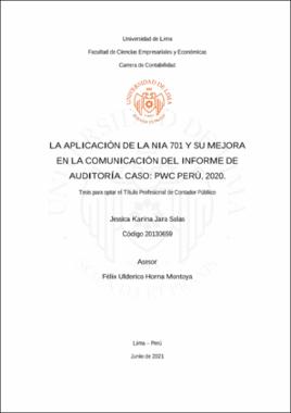 En el presente trabajo tiene como finalidad analizar la influencia de la aplicación de la NIA 701 en la comunicación del informe de auditoría emitido por PwC Perú en el año 2020. Las cuestiones claves de la auditoría son aquellos que, a juicio profesional del auditor, son los más significativos y han demandado un nivel de atención significativa de su parte en la auditoría de los estados financieros del periodo actual. Actualmente en el Perú, la Junta de Decanos de Colegios de Contadores Públicos del Perú aprobó el “Manual de Pronunciamientos Internacionales de Control de Calidad, Auditoria, Revisión, Otros Encargos de Aseguramiento y Servicios Relacionados”, edición 2016 – 2017 en la versión oficial en español traducido por IFAC (La Federación Internacional de Contadores), donde se encuentra el grupo de nuevas normas y modificaciones a normas para la presentación del informe de auditoría. Por esta razón, el estudio se enfocará en PwC - Perú que es la única compañía que ha emitido un informe de auditoría de conformidad con la Norma Internacional de Auditoría 701 (NIA 701). El estudio es de tipo aplicada, diseño no experimental y de tipo transversal, además, por el instrumento que se aplica es de enfoque mixto. Por lo tanto, la población será 31 funcionarios (gerentes y socios) que tienen conocimiento de la Norma y participaron de la auditoría que se hizo a Credicorp LTD y Subsidiarias (Perú) la única empresa auditada bajo la NIA 701. Y de los cuales se hizo el muestreo de 15 de estos funcionarios quienes se sometieron a una entrevista para determinar cómo esta normativa ha influido en la comunicación del informe de auditoría. Como resultados se obtiene que la mayoría de los funcionarios tiene un mejor panorama en el desempeño del auditor con la NIA 701, al revelar las cuestiones clave los grupos de interés tendrán un mejor enfoque de lo que se comunica en el informe de auditoría. The purpose of this work is to analyze the influence of the application of ISA in the communication of the PwC Peru audit report in 2020. The key audit issues are those that, in the auditor's professional judgment, they are the most significant and have demanded a significant level of attention on your part in the audit of the financial statements of the current period. Currently in Perú, The Board of Deans of Colleges of Public Accountants of Perú approved the "Manual of International Pronouncements of Quality Control, Audit, Review, Other Assurance Engagements and Related Services", edition 2016 - 2017 in the official version in Spanish translated by IFAC (The International Federation of Accountants), which contains the group of new standards and modifications to standards for the presentation of the audit report. For this reason, the study will focus on PwC-Peru, which is the only company that provides the audit report in accordance with International Standard on Auditing 701. The study is of an applied type, non-experimental design and of a cross-sectional type, in addition, due to the instrument applied it is a mixed approach. Therefore, the population will be 31 officials (managers and partners) who are aware of the Standard and participated in the audit that was made to Credicorp LTD. and subsidiaries, the only company audited under ISA 701. And of which 15 of them were sampled. these officials who underwent an interview to determine how this regulation has influenced the communication of the audit report. As a result, it is obtained that most of the officials have a better overview of the auditor's performance with ISA 701, by revealing the key issues, the stakeholders will have a better focus on what is communicated in the audit report.