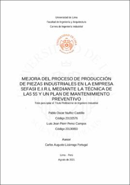 Nuñez Castillo, P. O. y Perez Campos, L. J. P. (2021). Mejora del proceso de producción de piezas industriales en la empresa SEFASI E.I.R.L mediante la técnica de las 5S y un plan de mantenimiento preventivo [Tesis para optar el Título Profesional de Ingeniero Industrial, Universidad de Lima]. Repositorio institucional de la Universidad de Lima. https://hdl.handle.net/20.500.12724/14315Editor