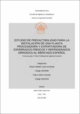 Cuba Anchante, A. M. y Salem Scander, F. (2021) Estudio de prefactibilidad para la instalación de una planta procesadora y exportadora de espárragos frescos y refrigerados dirigidos al mercado español [Tesis para optar el Título Profesional de Ingeniero Industrial, Universidad de Lima]. Repositorio institucional de la Universidad de Lima. https://hdl.handle.net/20.500.12724/14329Editor