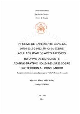 Informe de Expediente Civil No. 00795-2012-0-0412-JM-CI-01 sobre Anulabilidad de Acto Jurídico. Informe de Expediente Administrativo No 1645-2014/PS3 sobre Protección al Consumidor