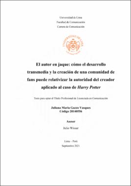 Gazzo Vasques, J. M. (2021). El autor en jaque: cómo el desarrollo transmedia y la creación de una comunidad de fans puede relativizar la autoridad del creador aplicado al caso de Harry Potter [Tesis para optar el Título Profesional de Licenciado en Comunicación, Universidad de Lima]. Repositorio Institucional de la Universidad de Lima. https://hdl.handle.net/20.500.12724/14705Editor